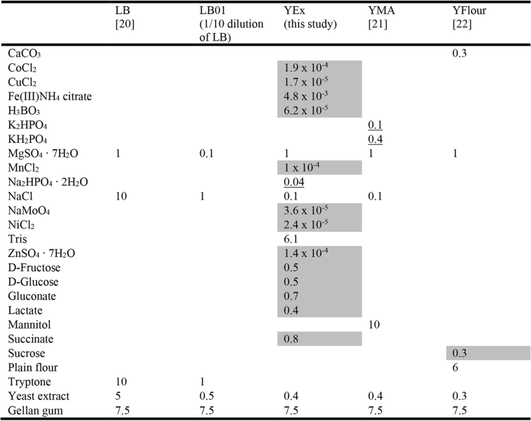 Table 1 Composition of the growth media. Products are given in g L− 1 distilled water. Products marked in grey were filter-sterilized before being added to the other autoclaved components. Phosphate-containing components (underlined) were separately autoclaved. All growth media have pH 7.0